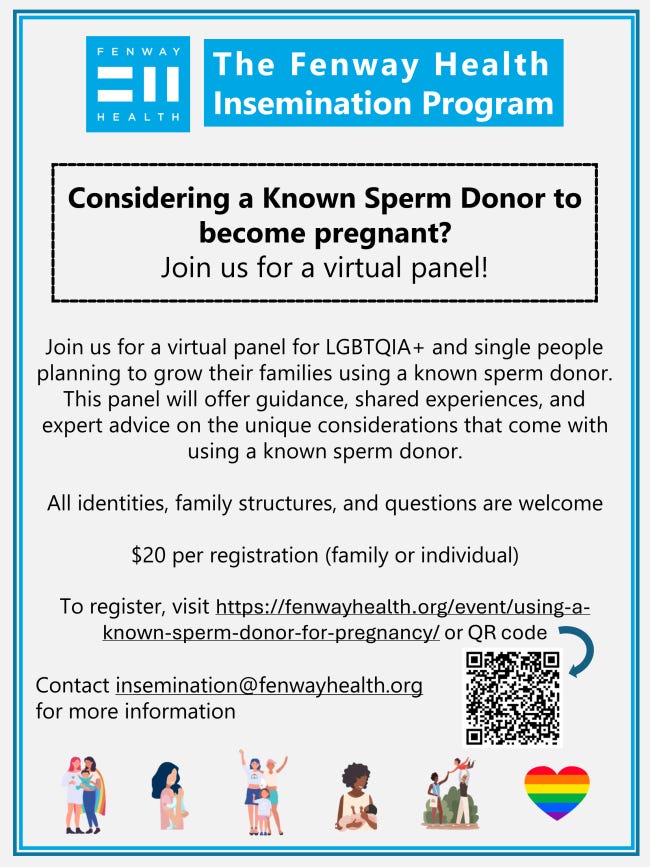 Join Fenway Health for an virtual panel focused on LGBTQIA+ and single people planning to grow their families using a known sperm donor.